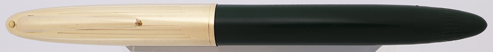Condition Excellent condition with no cracks or chips. This is a dark green pen with a golden cap with a graduated line pattern that is shiny and good looking. The barrel has moderate scratching, with a jagged scratch and some heavier wear as well as bite marks at the end of the barrel. The end of the barrel also has a slight bulging area. The cap has moderate microscratching. The top of the cap is dented. The white dot has yellowed and it has a dark ring just inside the edge. The imprints are clear.