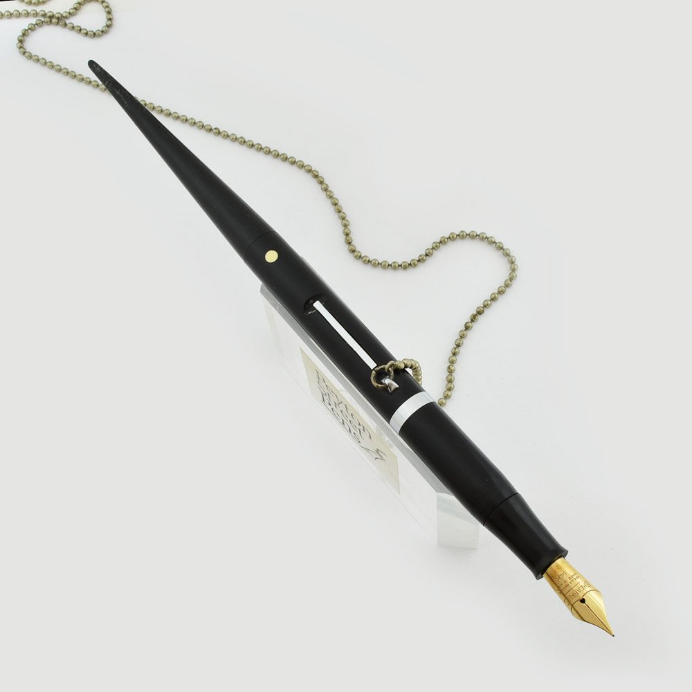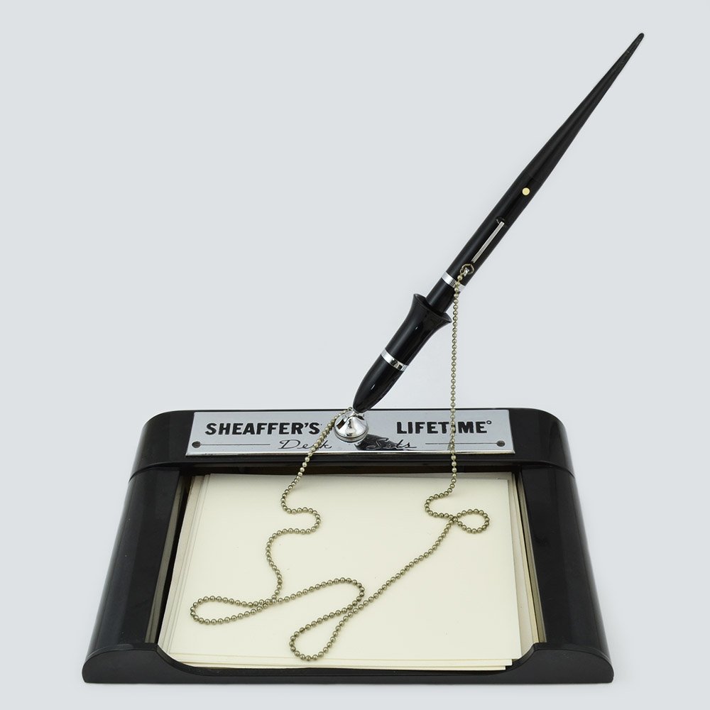 Type We think this fountain pen was probably a dealer promotion. It's a fountain pen chained to a base with a place for a pad of paper, and says "Sheaffer's Lifetime Desk Sets."