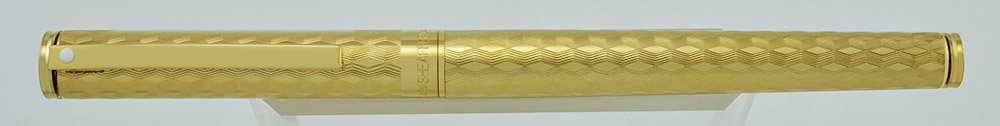Color Gold plated pen in a "diamond cut" pattern off vertical wave like lines with diamond shaped smooth pieces.