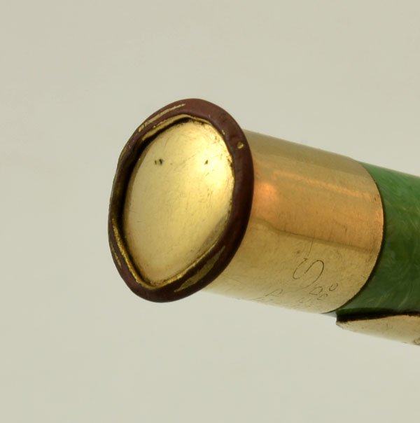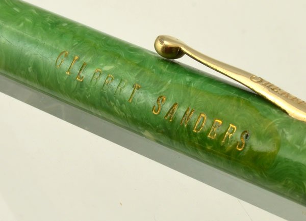 Condition User grade condition, though it works perfectly. There's some brassing on the top edge of the top part, and it's a little squished down, but the celluloid is really nice and unstained. The pen is personalized GILBERT SANDERS.