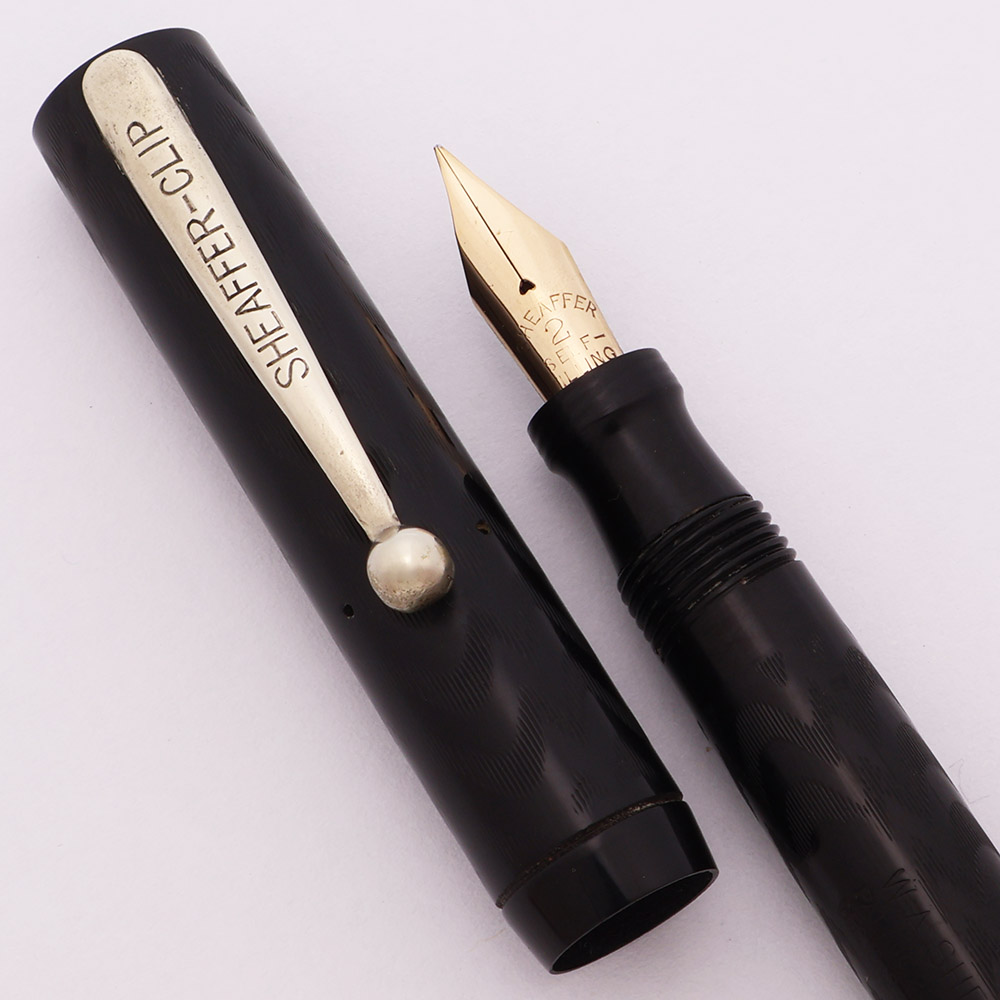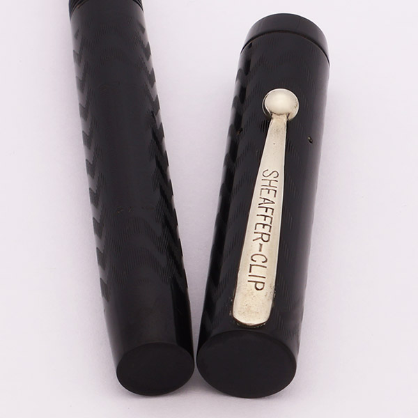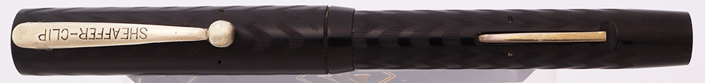 Condition Excellent condition with no chips, dents, or dings. This is a small classically designed pen. The color is excellent, still a consistent dark black. The chasing is distinct. The barrel looks excellent with just a little wear on the flat end. The cap has a small crack at the cap lip and some surface wear along the top of the cap above and around the clip. The plating on the clip is almost completely worn off -- there is a little left on the ball end. The imprints are clear.