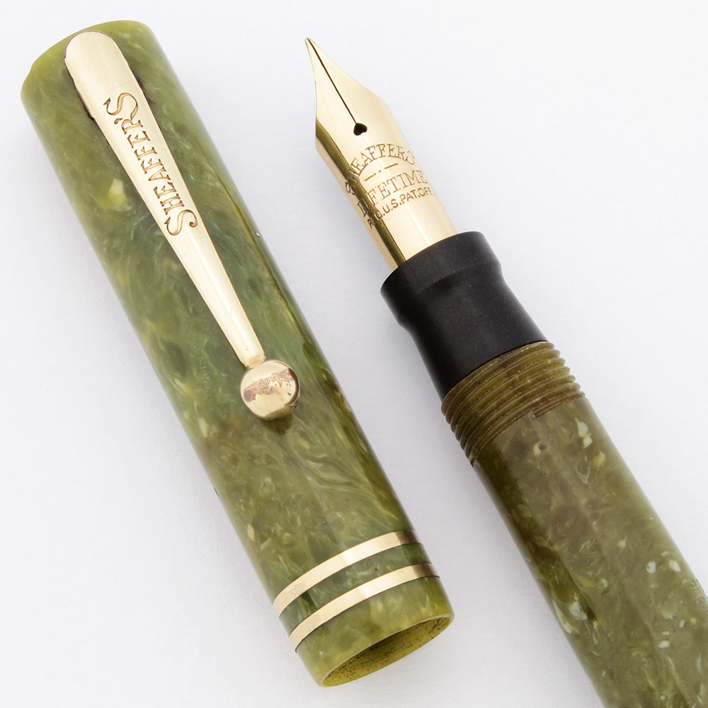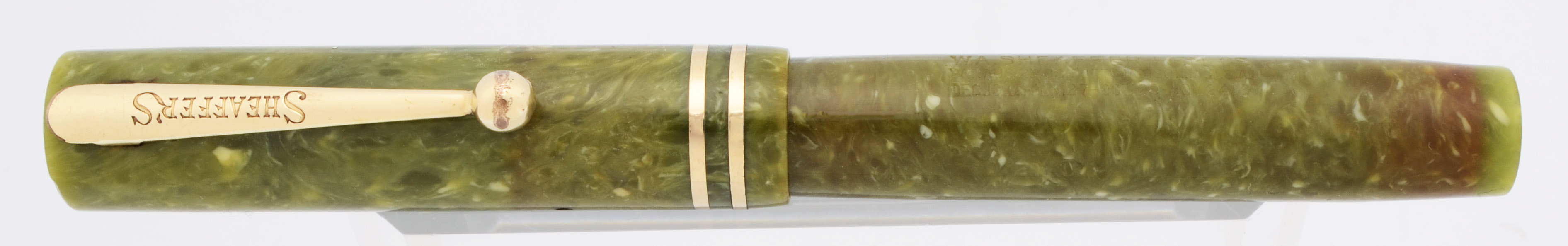 Condition Very nice condition with no cracks. This is a small, shiny pen in a nice color. The green marble has a bit of discoloration in a band at the lever of the clip ball and on the barrel. But, in general, the green marble looks quite nice. The barrel has marks caused by the cap lip and moderate scratching. The cap has moderate to some heavy scratching on the flat the top. The cap lip has some small short lines that could become cracks, but they aren't yet. The lever has moderate scratching as well as some plating wear and pitting on either end. The two cap bands have quite a bit of microscratching, but no brassing. The clip has plating wear on the ball end and along the top edge. The imprints are clear.
