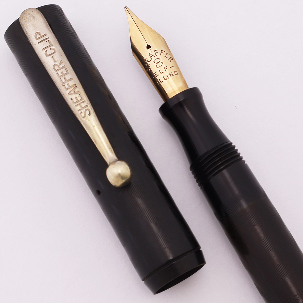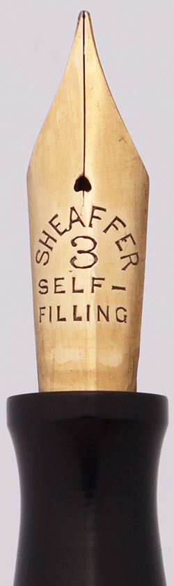 Nib FINE Sheaffer's #3 Self-Filling gold nib is in excellent condition. Short hairline crack coming down from the breather hole, so the nib should not be over-flexed. Modest flexibility.