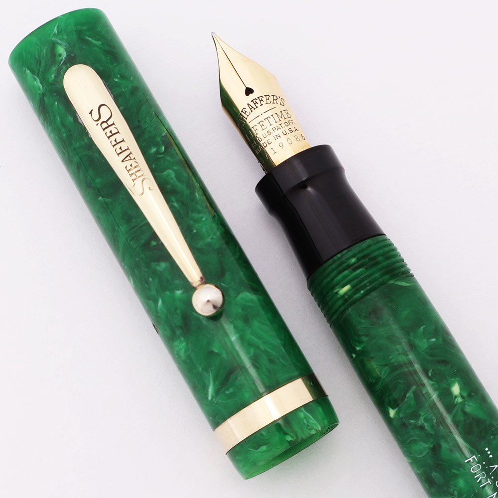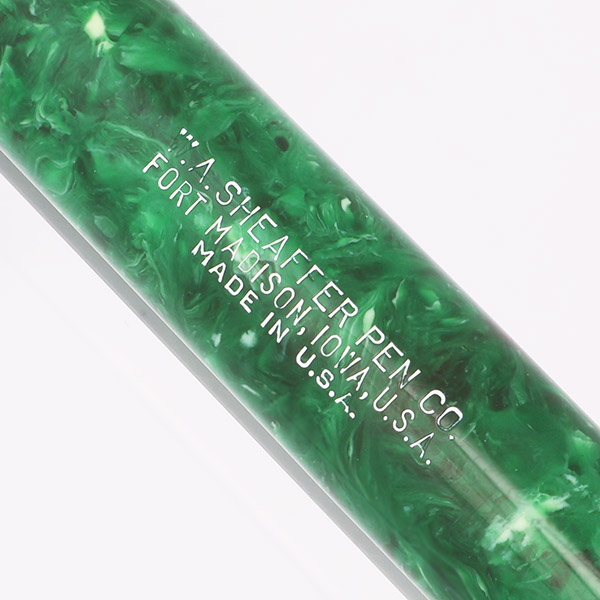 Condition Superior condition with no cracks, chips, dents, or dings. This is a large-sized, shiny pen, in a beautiful jade green color. The color is very consistent, and really strong. A lot of times when we see this pen, there are significant differences in barrel vs. cap color, or one part has turned dark, or faded, or yellowed, but this pen has really strong, beautifully green color. There is light scratching and handwear on the cap and barrel. The end of the barrel has some slight darkening, as well as some scuffing. There are some light marks from the cap lip on the barrel. The lever has some brassing near the pivot end. The cap band has light scratching, and some of the edges show the beginning of brassing. The clip has some plating wear on the ball end. The dot at the top of the cap is excellent. The imprints are clear.