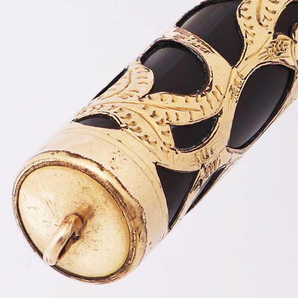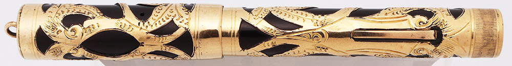 Color Gold-filled filigree overlay on black hard rubber. The catalogs say that the filigree is 18k gold-filled.