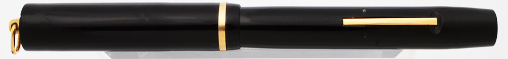 Condition Excellent condition with no cracks. This is a small, velvety black, shiny pen that looks great. The cap and barrel have light scratching. The edge of the flat top of the cap has a very small chip. The lever and cap band have microscratching. The ring top hardware looks good with a little plating wear along edges and on the top of the mount. The imprints are clear.