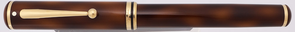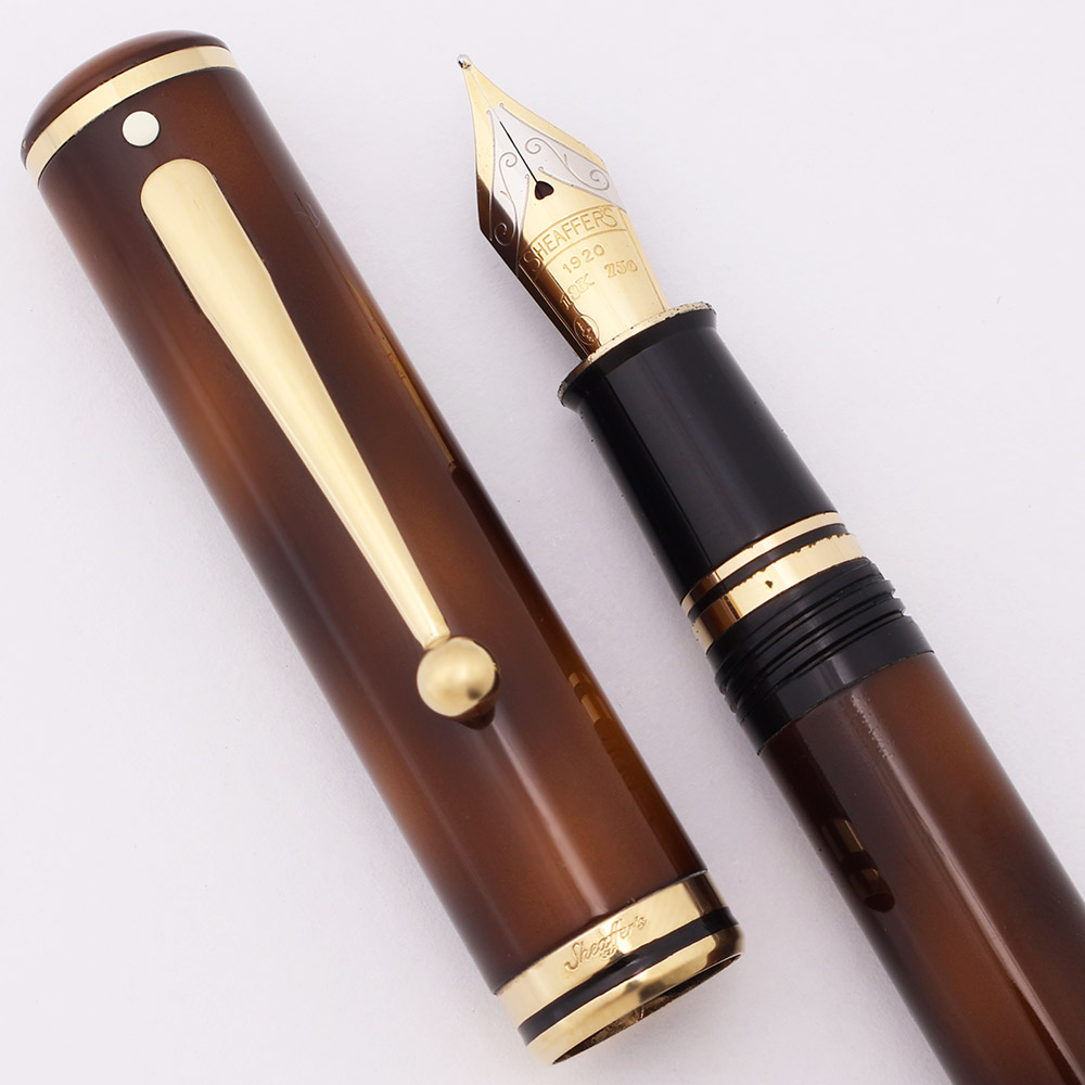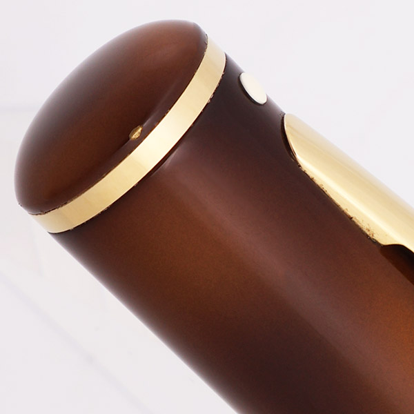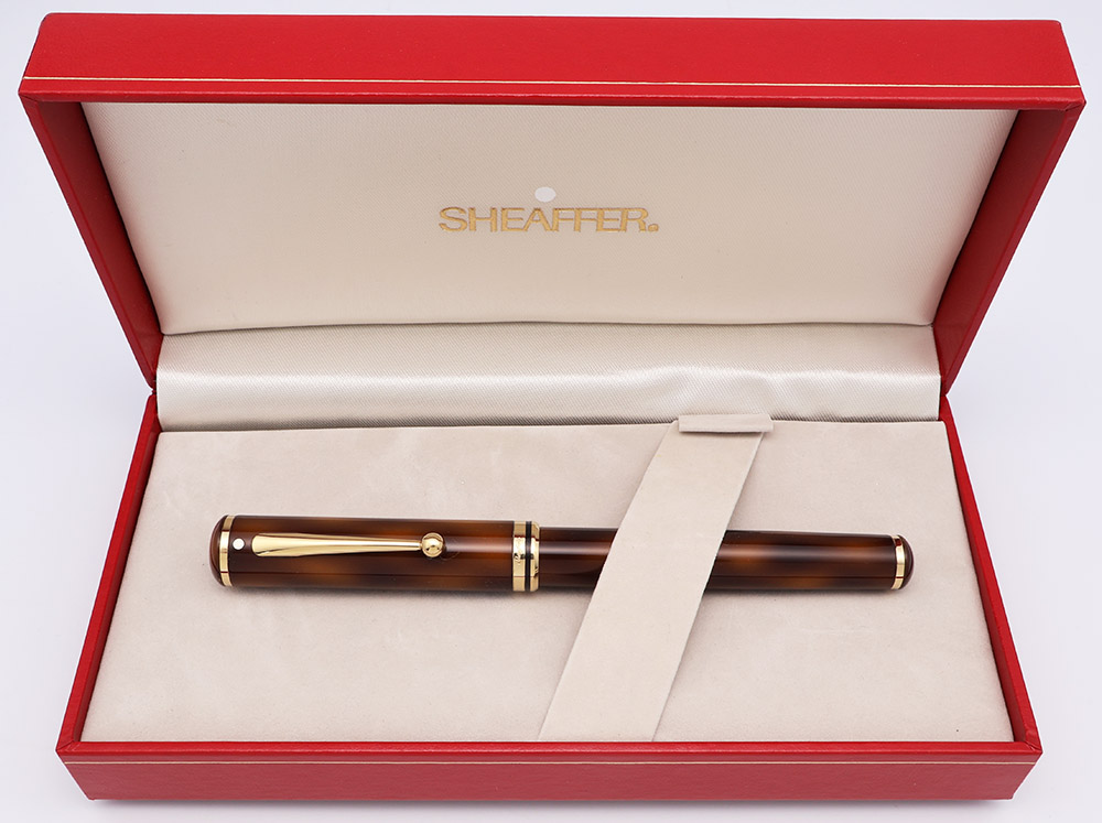 Condition Excellent condition. This is a weighty, beautiful, shiny pen in a lovely color pattern. The cap and barrel look good. There is a small chip in the brown lacquer end piece, and a similar one just above the top cap band. The gold ring on the section nearest the nib has a lot of pitting in the gold plating, as seen in the photos. The two trim bands on the section also show pitting. The clip looks great and the white dot is perfect. The imprints are clear. In Sheaffer box.