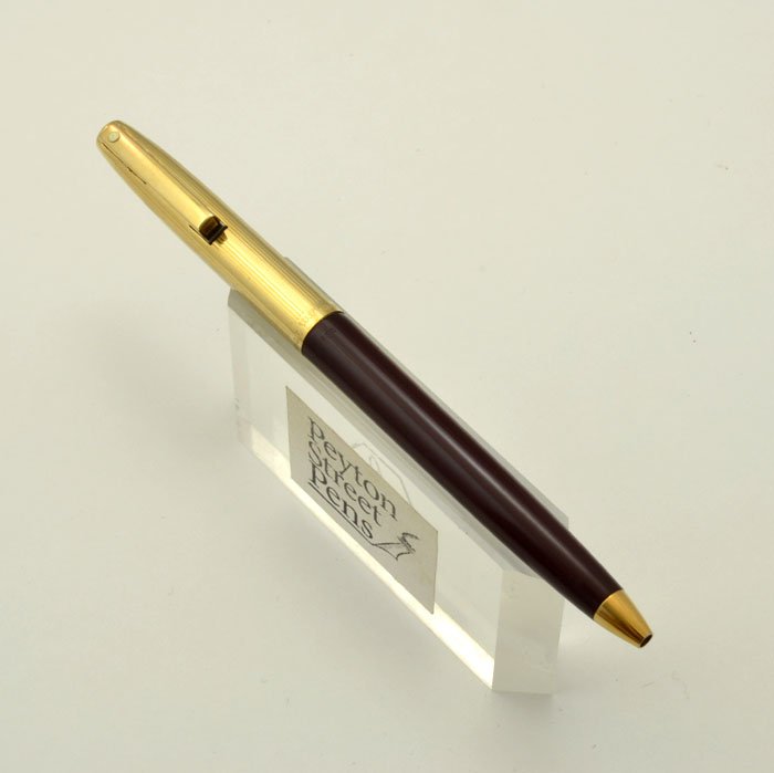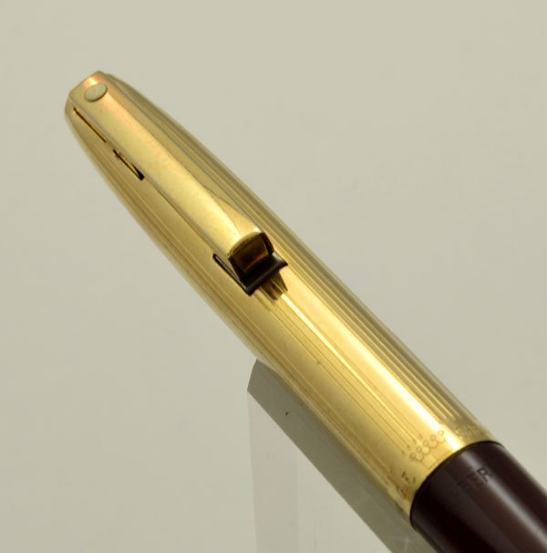 | Color | 12k Gold filled cap with a pattern of 4 engraved lines alternating with an unlined area. The barrel is burgundy. |