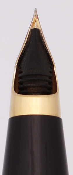 Nib EXTRA-FINE two-toned PdAg (palladium-silver) nib. The gold color is masking. You'll see these Imperial IIIs with both single-tone and two-tone palladium silver nibs. There's a slight "waverly" upturn.