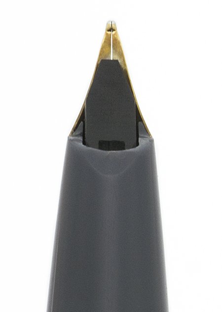 Color Gray plastic cap and barrel with gold plated trim and a wide cap band.