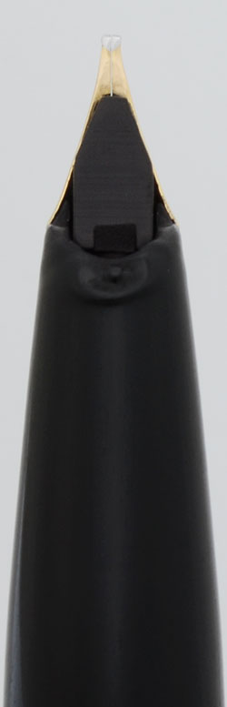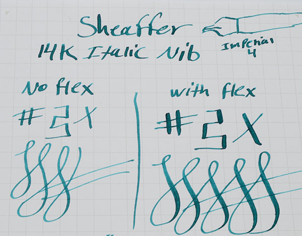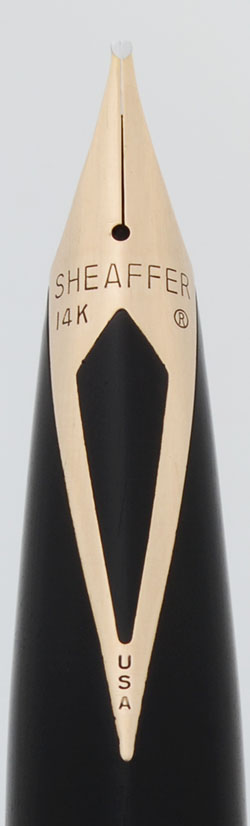 Nib STUB Sheaffer's 14k gold long diamond style inlaid nib is smooth with appropriate tipping material. It's a clean, nice looking nib. See writing sample, below for how the pens writes with and without flex.
