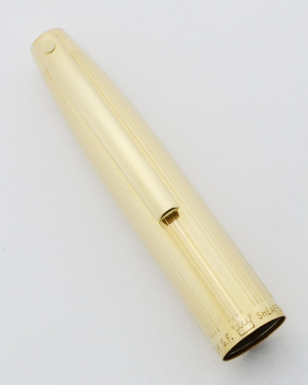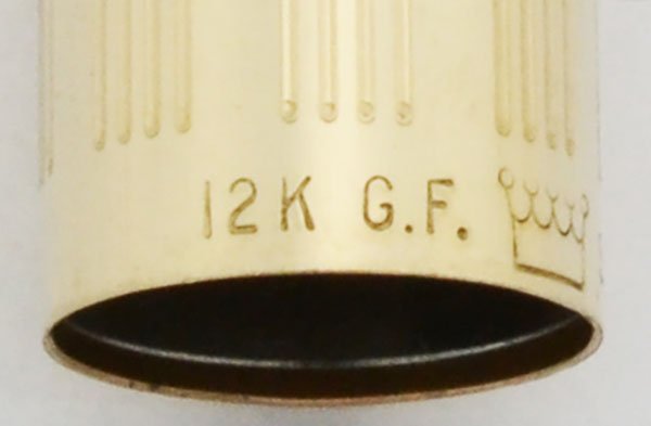 Color 12k gold filled cap with grouped lines pattern. It has the crown on the cap lip that later on indicates electroplated, but clearly states that it is, "12K G.F." It has a long clip.