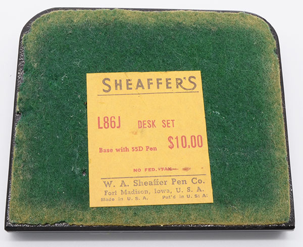 Condition The pen is excellent and very smooth to the touch with no wear or scratches. The color is slightly uneven, with a lighter colored area near the imprint. The imprint is clear and easily readable. The base is excellent, with no significant nicks or scratches. The felt base has some small holes and is slightly ragged along some of its edges. Model number sticker is still attached and easily readable.