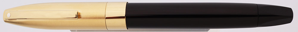 Color Black laque barrel and section with brushed gold cap and gold trim. White dot at the top of the clip. Wide 3/8" gold plated cap band.