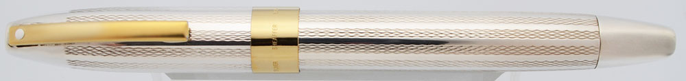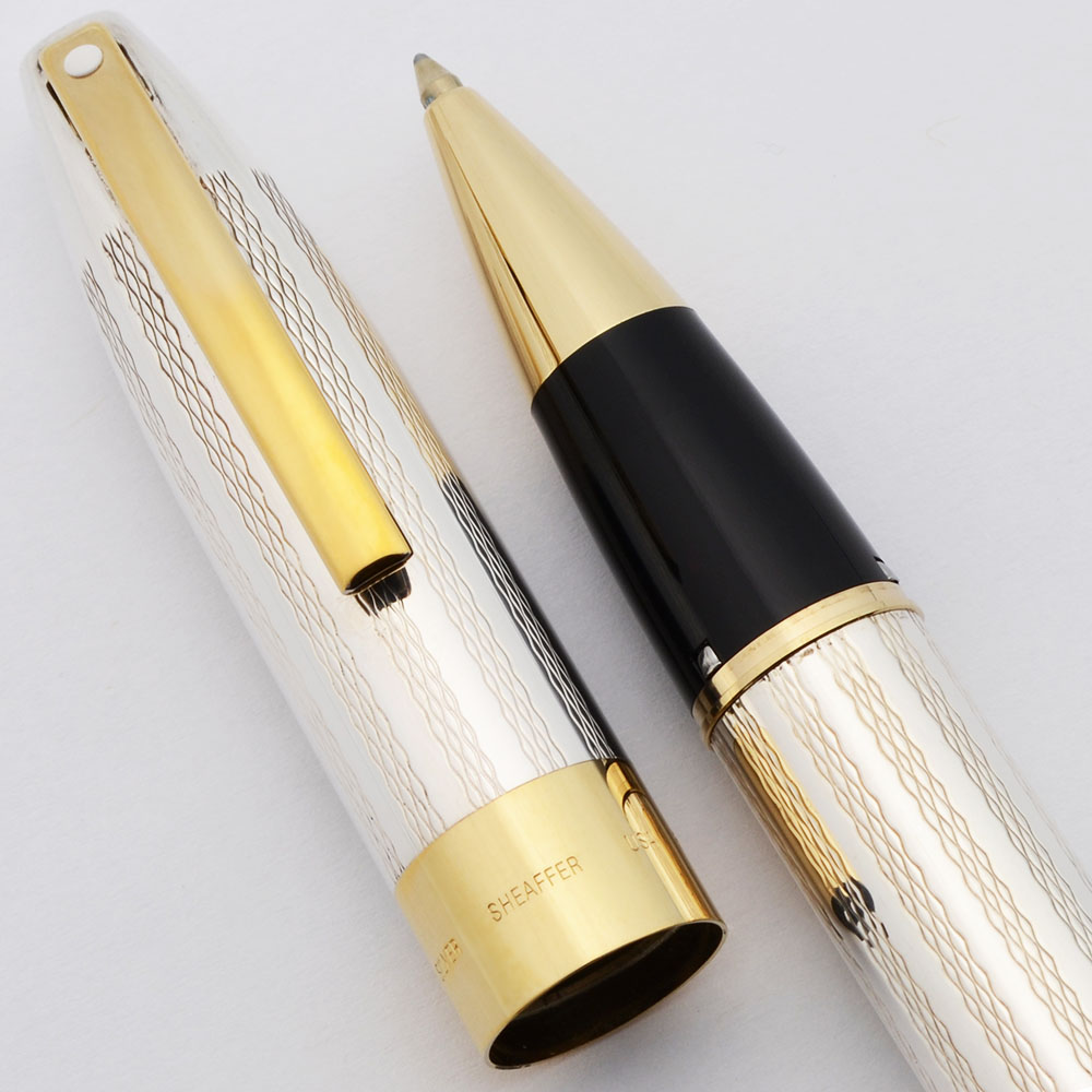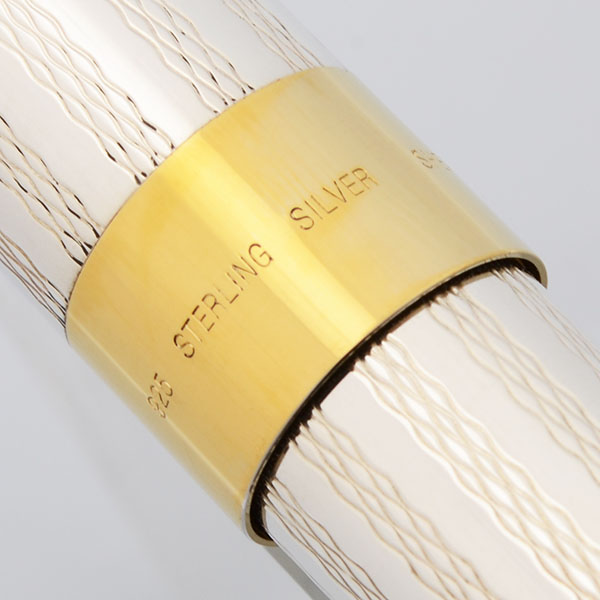 Color Sterling silver body (hallmark on cap band) with a lovely pattern of "interrupted barleycorn". Gold plated cap band and clip. Black section. White dot.