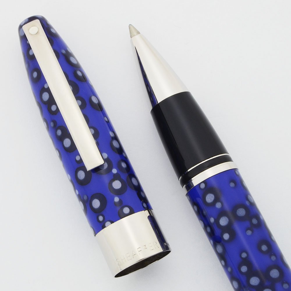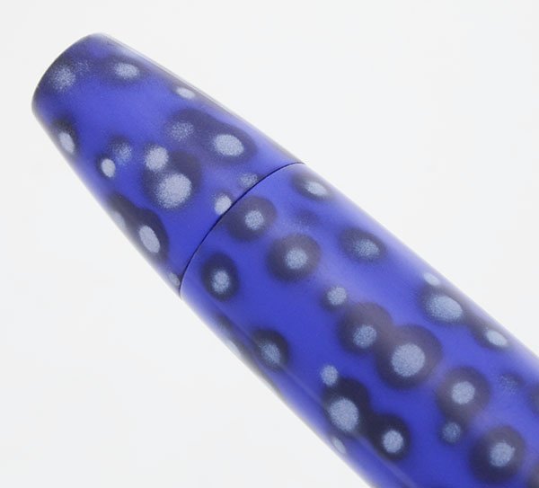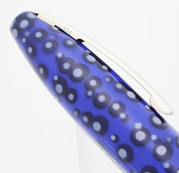 Color Black Pearl Special Edition coloring comprised of a royal blue background with lighter blue (almost lilac) bubbles surrounded by black outlined circles. Palladium plated clip and trim, including a 3/8" cap band. The clip includes a white dot.