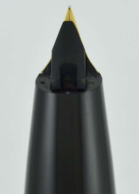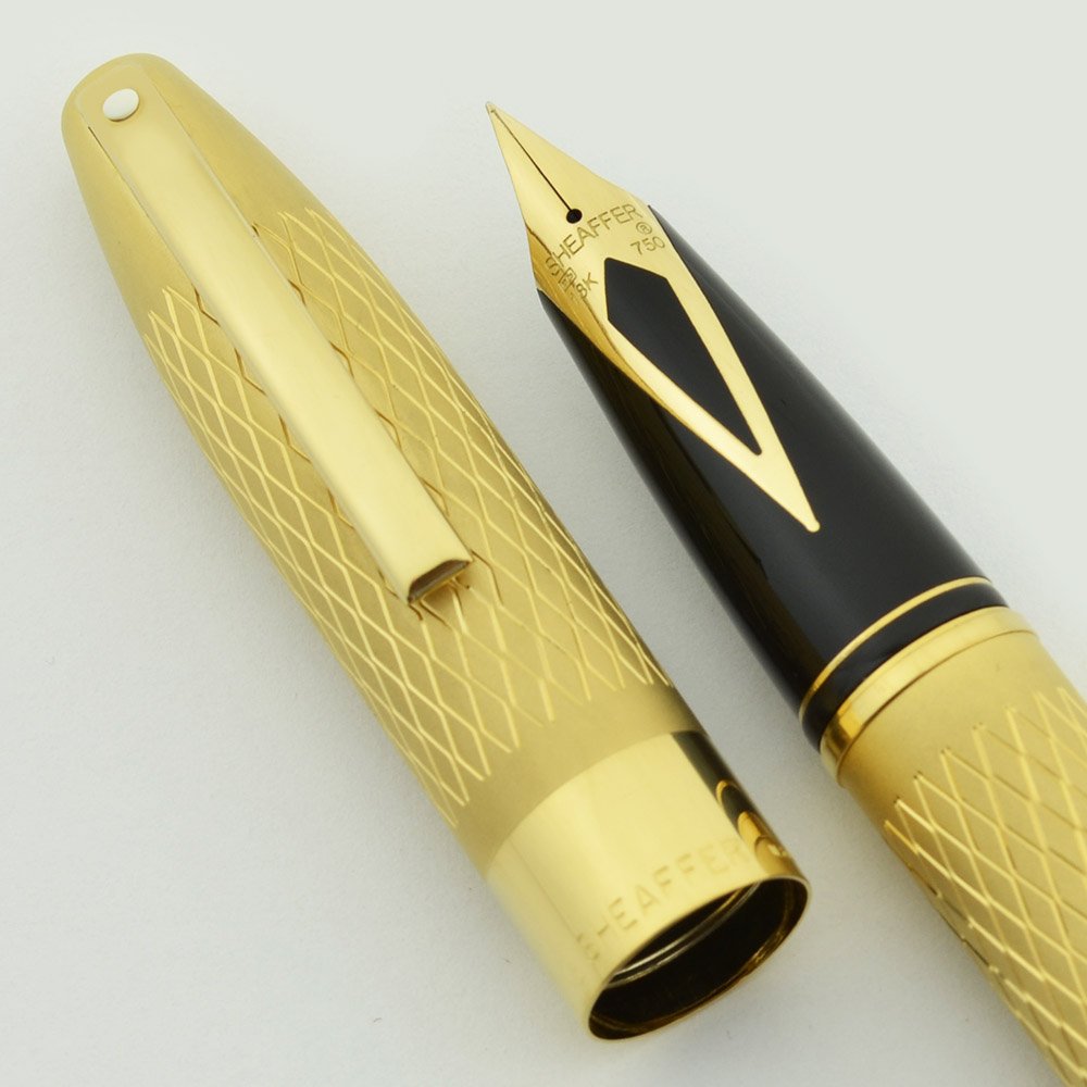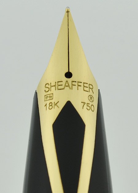 Nib Sheaffer 18kt 750 inlaid nib. Marked "F" on the section for fine. It has a little bit of give and a diamond inlaid pattern that matches the pen design.