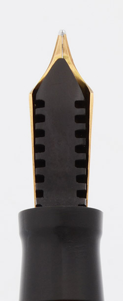 Nib MEDIUM Lifetime gold nib. There is a crack descending from the breather hole, but this does not affect the writing and will not get worse unless someone tries to see if this pen will flex - it will NOT! Lots of tipping material, and quite firm.
