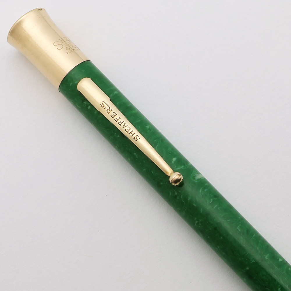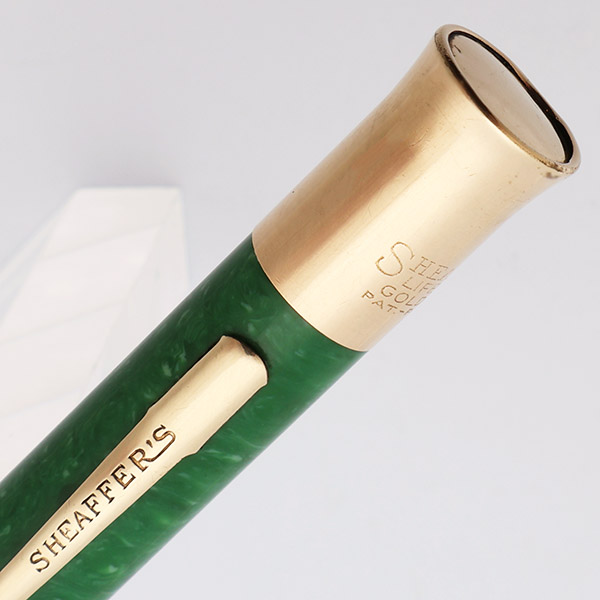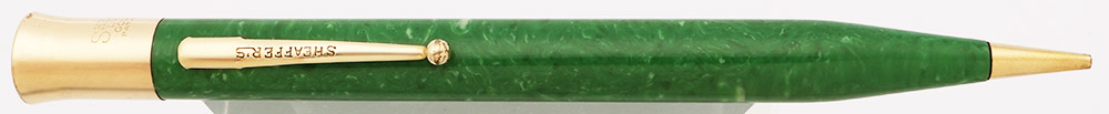Condition Excellent condition with no cracks, chips, dents, or dings. This is a large-sized mechanical pencil that is shiny and with brightly beautiful, smooth jade coloring. The jade body has light to moderate (especially alongside the ball end of the clip) scratching. The cone has some brassing and moderate scratching. The clip has plating wear on the ball end and microscratching. The gold piece that is the twisting mechanism has light to moderate microscratching, a tiny bit of pitting as well as plating wear along the top edge. The imprints are clear.