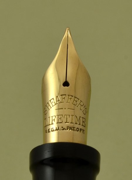 Nib | Gold Lifetime fine nib is large and in very good condition with tipping material. Typical Sheaffer nail, no flex |
