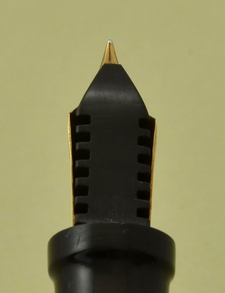 The pen is in extra nice condition with way less than typical discoloration, just a slightly lighter area near the end of the barrel. Only light scratches. The trim shows minor brassing: a dot on the ball of the clip and the top edge, and the lower edge of the cap band. There are no cracks in the cap lip. (You'll do damage if you post the cap on the barrel, so if that is a requirement for you, buying this pen will result in heartbreak. The barrel is long and comfortable to write with, without the cap.) It has been restored with a new silicone sac and the filling system is working well. (We'll guarantee it for a year.) |