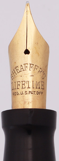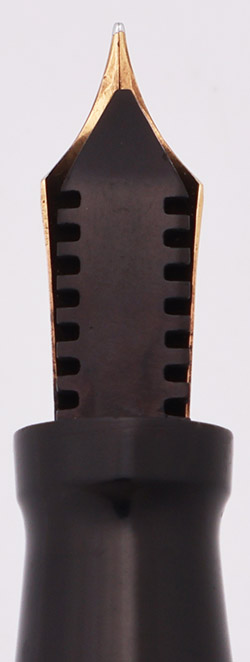 Nib Fine gold Lifetime Nib. The nib is large, fine, and firm. There's a scratch across the face of the nib which does not affect the writing experience.