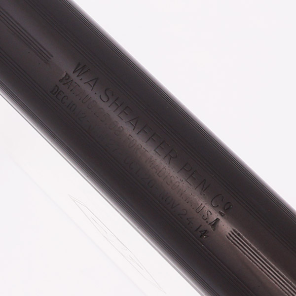 Condition Excellent + condition. There is light handwear and scratching on the cap and barrel. The color is strong and even on both the cap and barrel, and the lined pattern is clear. There is plating wear on the sides of the clip, and some brassing around the top of the clip and the ball end. The cap band has brassing along both edges. The cap lip is smooth and even. The lever has microscratching and some plating wear along the edges. The end of the barrel has moderate to heavy scratching. The imprint is faded, but still readable.