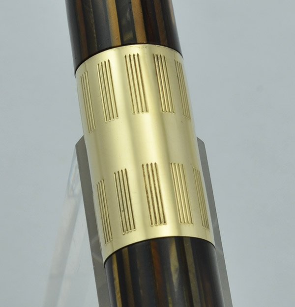 Color Brown striated with gold plated trim ... the cap band is approx. 7/8" wide. Pen has white dot.