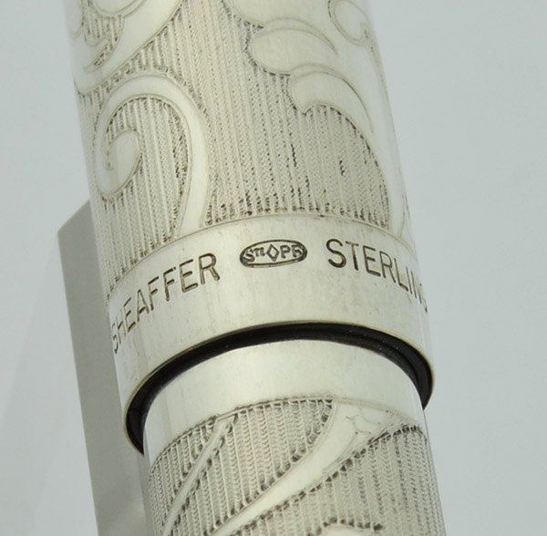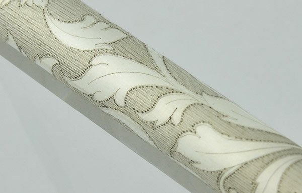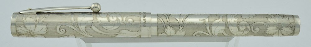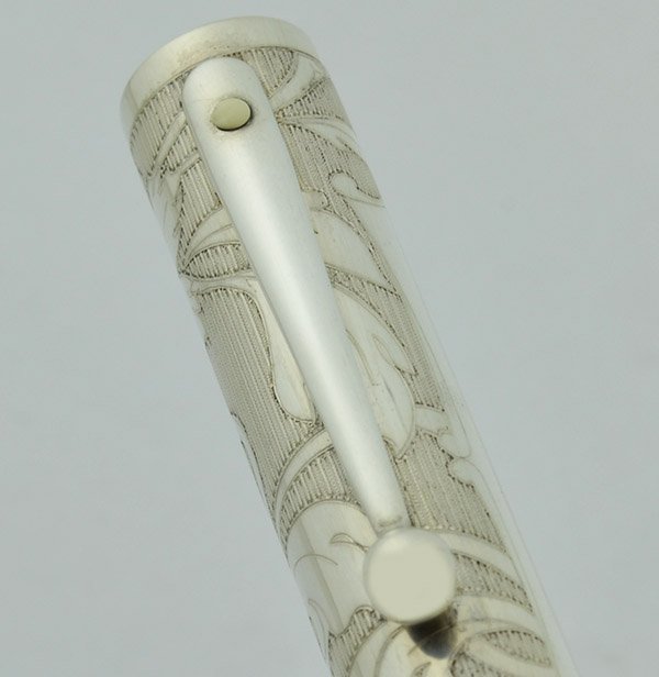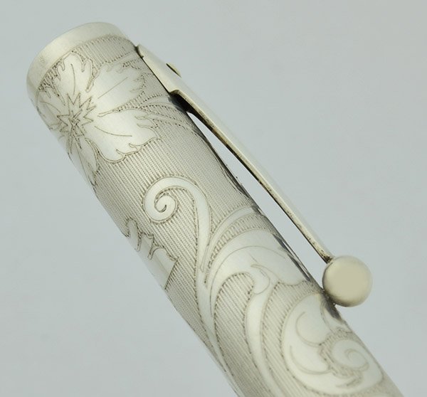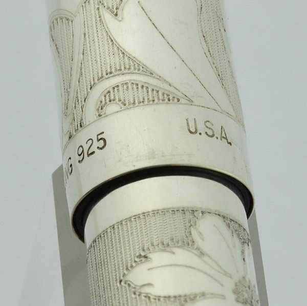 Color Sterling silver-etched floral pattern. This pen is solid 925 sterling except for the upper barrel and the section, which are black plastic