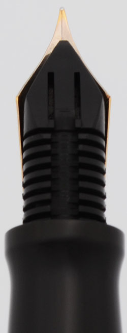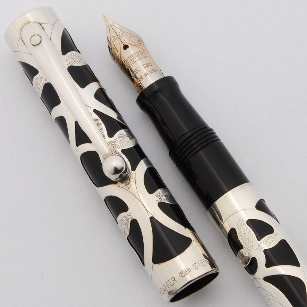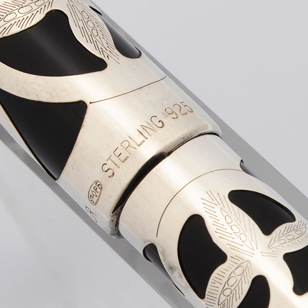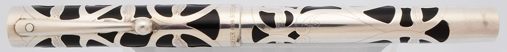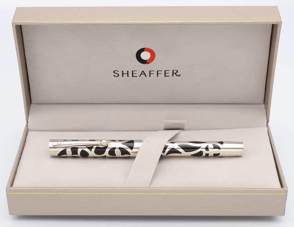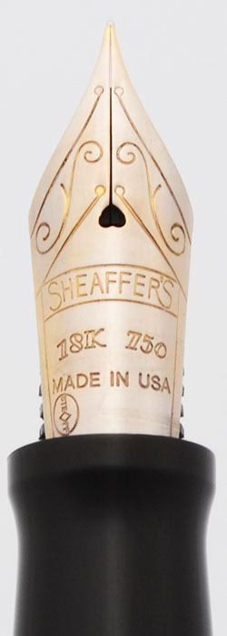 Nib FINE Sheaffer's 18k gold nib made in USA is smooth and bouncy with nice tipping material. Labeled "F" on the back of the section. We usually see the sterling filigree Nostalgias with two tone nibs, and the silver colored masking seems to be thinning on this nib.