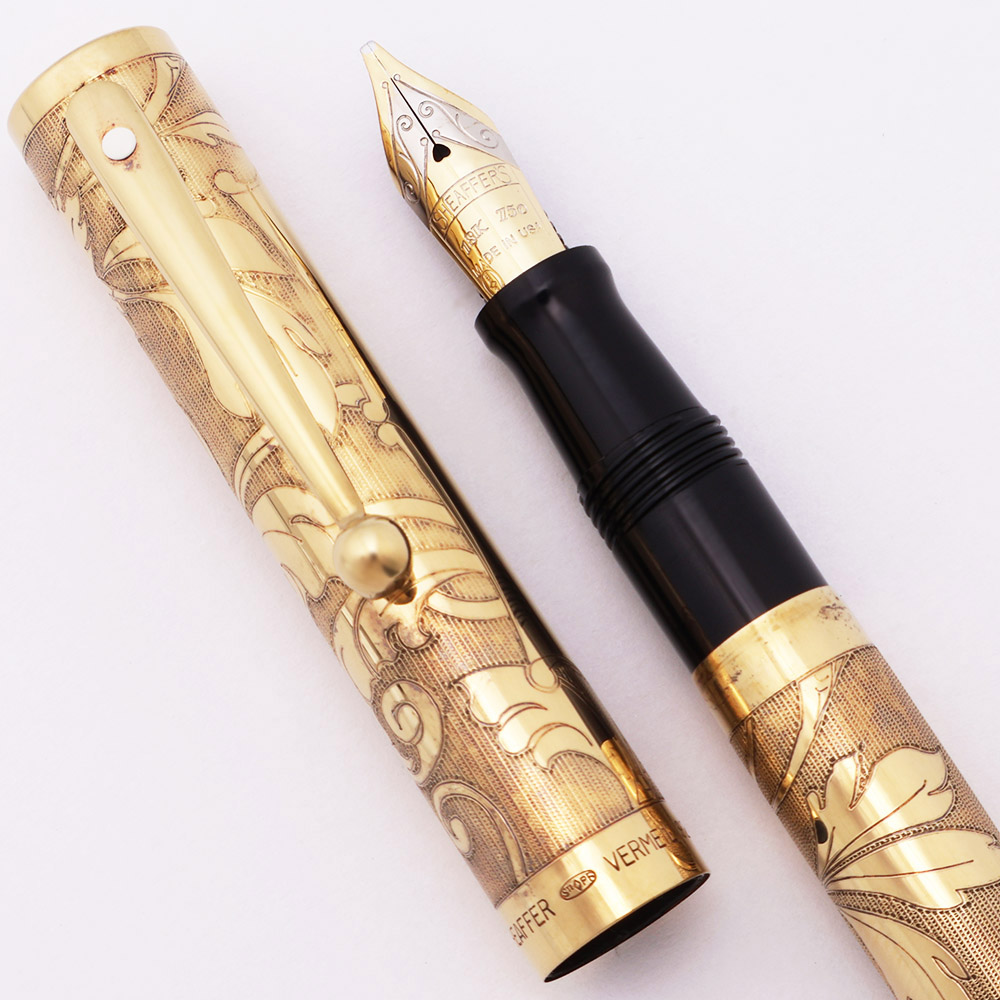 Color Vermeil (gold plate over sterling silver) in an etched floral pattern with a black plastic upper barrel and section.