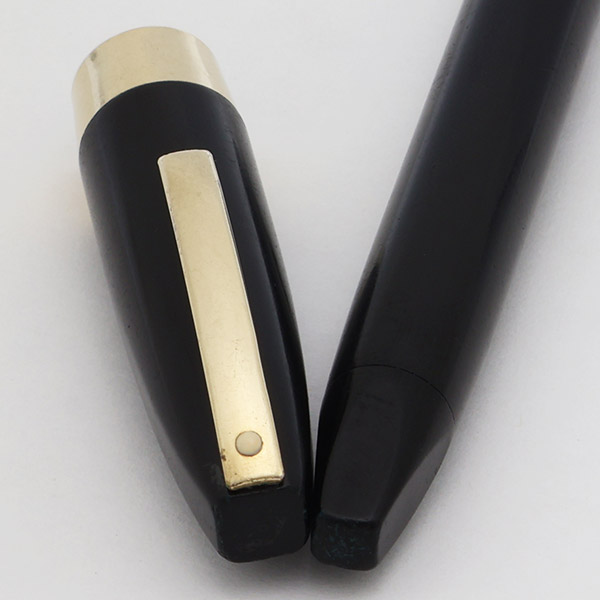 Condition Excellent condition with no cracks, chips, dents, or dings. This is a large, substantial pen with executive styling -- it is handsome and elegant and shiny. The cap and barrel have moderate scratching, and some heavier scratching in places. The end of the barrel and blind cap have heavy scratching. The wide 3/8" cap band and the clip have microscratching and polishing marks. The clip has some plating wear near the open end and on the top edge. The top of the cap has heavy scratching. The white dot looks great. The imprints are clear.