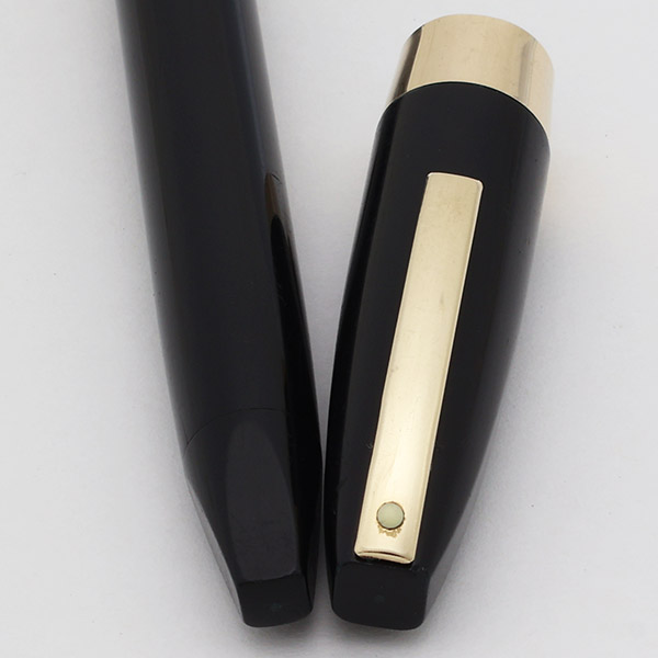 Condition Excellent condition with no cracks, dents, or dings. This is a large, substantial pen with executive styling -- it is handsome, and elegant, and shiny. The cap and barrel have moderate scratching, and some heavier scratching mainly on the cap. The blind cap has moderate to heavy scratching. The wide 3/8" cap band has moderate microscratching and polishing marks. The clip has light to moderate microscratching. The white dot on the top end of the clip is slightly yellowed. The top of the cap has heavy scratching and one small chip off one of the top corners above the clip, visible in the first and last photos below. The imprints are clear.