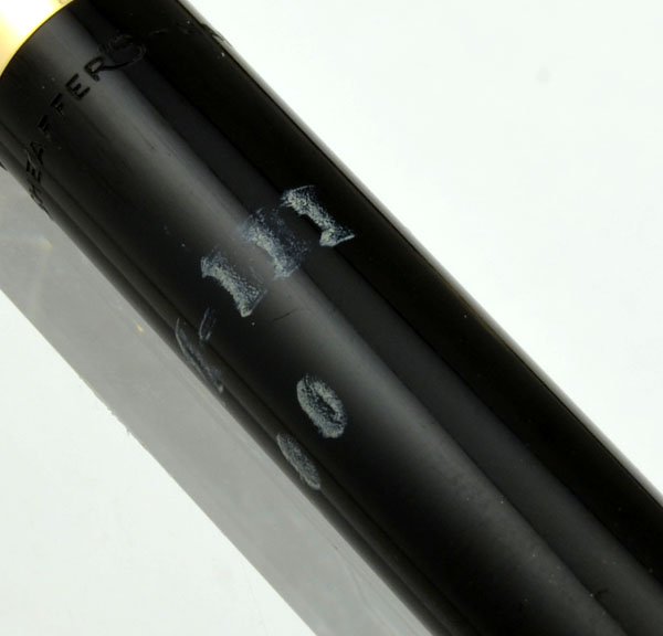 | Nib | The nib is fine, and is indicated by the chalk mark on the barrel. The nib is in virtually un-used condition with all the original tipping material. Excellent ink flow. |