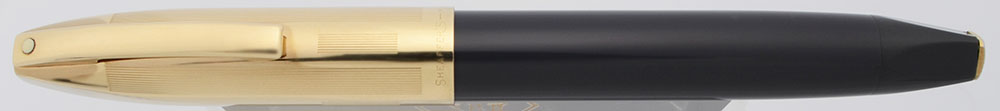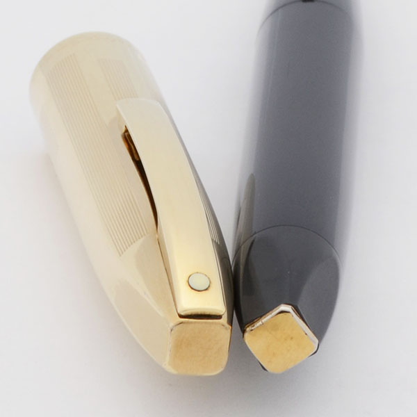 Condition Superior condition with no cracks, chips, dents, or dings. This is an impressive, shiny pen, in a nice-looking color scheme. The section and barrel are very clean, with just some marks caused by the cap lip. The cap is near mint, it has a pattern of twelve long lines followed by a pattern of eight short lines, with space in between, has light polishing marks. The clip has some small scratches at the end. The white dot looks nice; it has a little bit of black around the edges. The imprints are clear. The gold filled square piece on the end of the blind cap is slightly turned (see photo below).