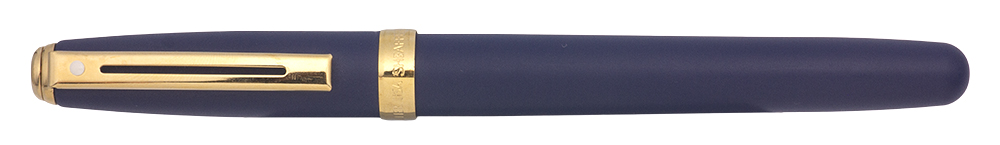 Color Matte Navy Blue with gold plated trim. White dot on the top of the clip. Gold top on cap. Black Section.