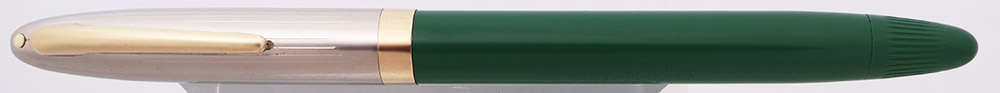 Color Green body with stainless steel cap. The cap has a gold filled cap band and clip and the steel has a lined pattern. Lined black section.