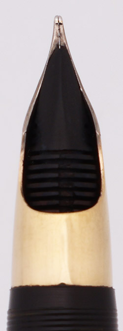 Nib FINE two-toned 14k conical nib, with a bit of an upturn towards the tip.