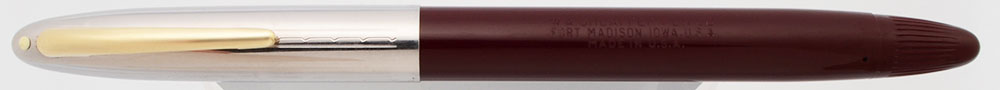 Color Burgundy with a steel cap (with a pattern of two straight lines surrounding one line that has pointed squiggles), and gold clip. Unusual white dot above clip (not typical for these pens).