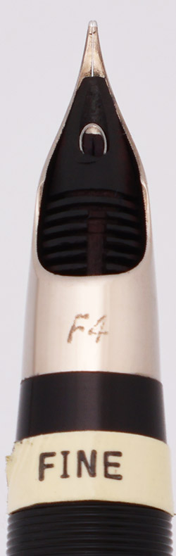 Nib FINE palladium-silver conical Triumph nib, labeled F4 which marks it as a fine. There is also a sticker on the section confirming this.