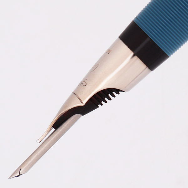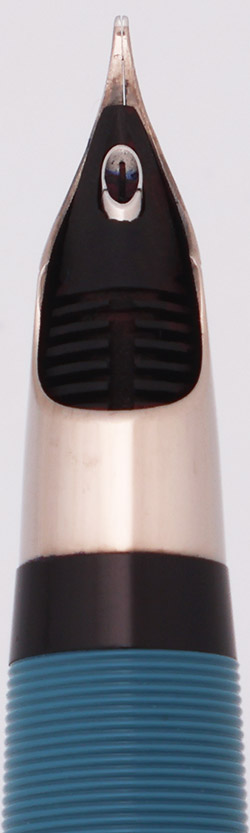 Nib FINE single tone PdAg (palladium silver) Triumph nib is un-marked with regard to size. It looks a little wider than the fines we usually see. It's smooth and firm with nice tipping material and a very slight upturn toward the tip of the nib.