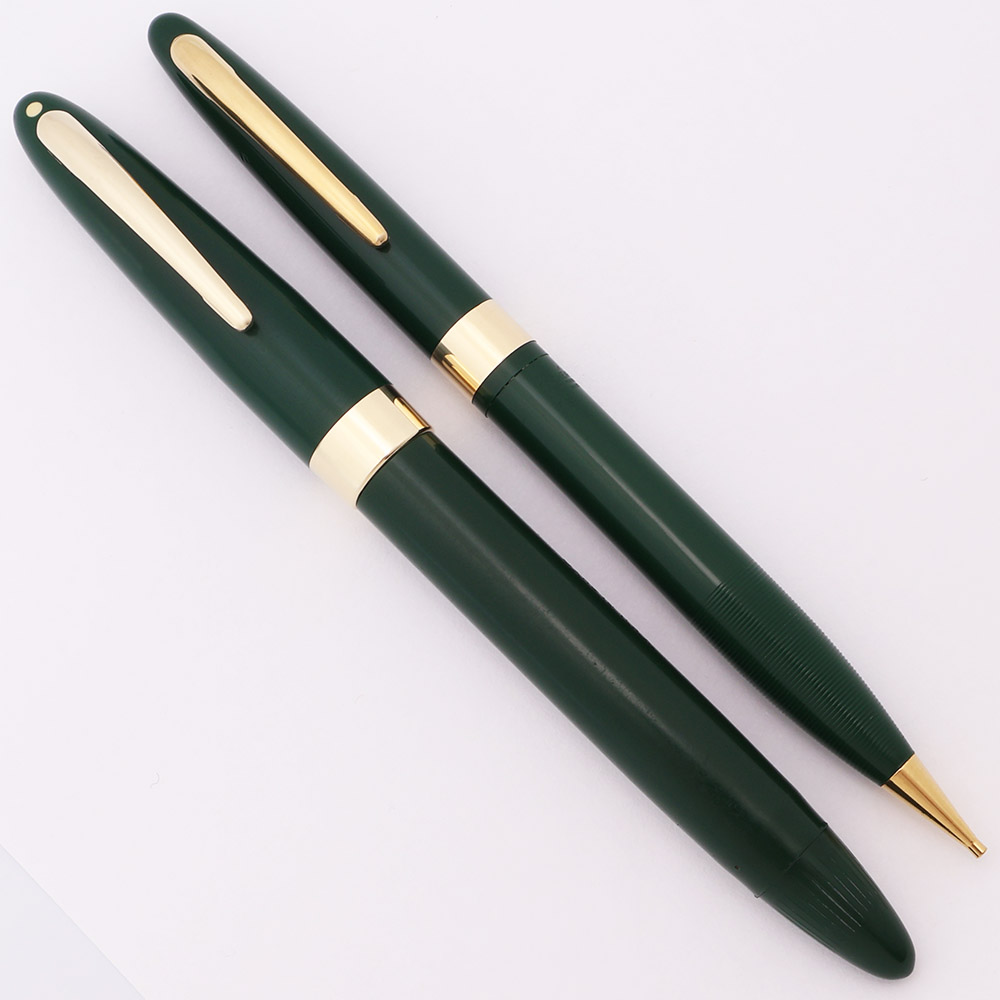 Condition Excellent condition with no cracks, chips, dents, or dings. This is a handsome, stately set in a deep green color. Fountain Pen: The cap and barrel have light to moderate scratching. There are some long (about 1"), thin scratches on the cap to the left of the clip. The clip has touches of plating wear long the sides. The cap band has light scratching, but no brassing or plating wear. The white dot looks good. The section looks good, with no interruptions in the ridges there. The barrel has light scratching all over. The end of the barrel where the blind cap joins has some slight irregularities in the plastic, which do not affect the pen's function. Mechanical pencil: There is light to moderate scratching all over. The cap portion has a couple of small tooth or melt marks near the clip. The clip and cap band have scratching, but no brassing or plating wear. The ridges near the cone look good. The cone has light scratching and a few tiny dots of pitting. The imprints on both pieces are clear.