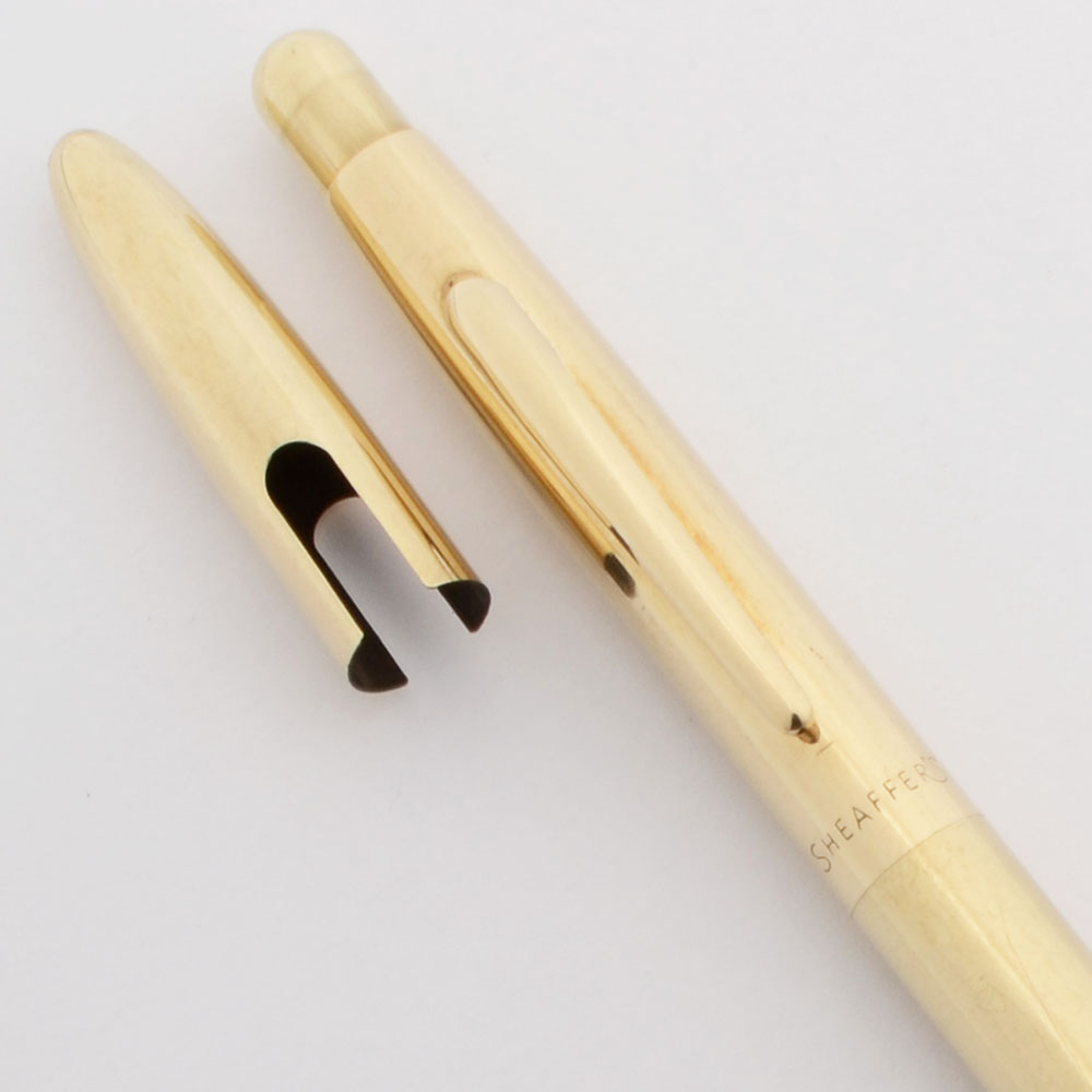 Condition Excellent condition with no cracks or chips. This is a very shiny, smooth, gold pen that is long and elegant. The surface has microscratching with some heavier scratch lines where the tip protector is located (caused by removing and replacing it). There is also some heavier scratching on the depresser caused by usage. The cap also has microscratching. The imprints are clear.