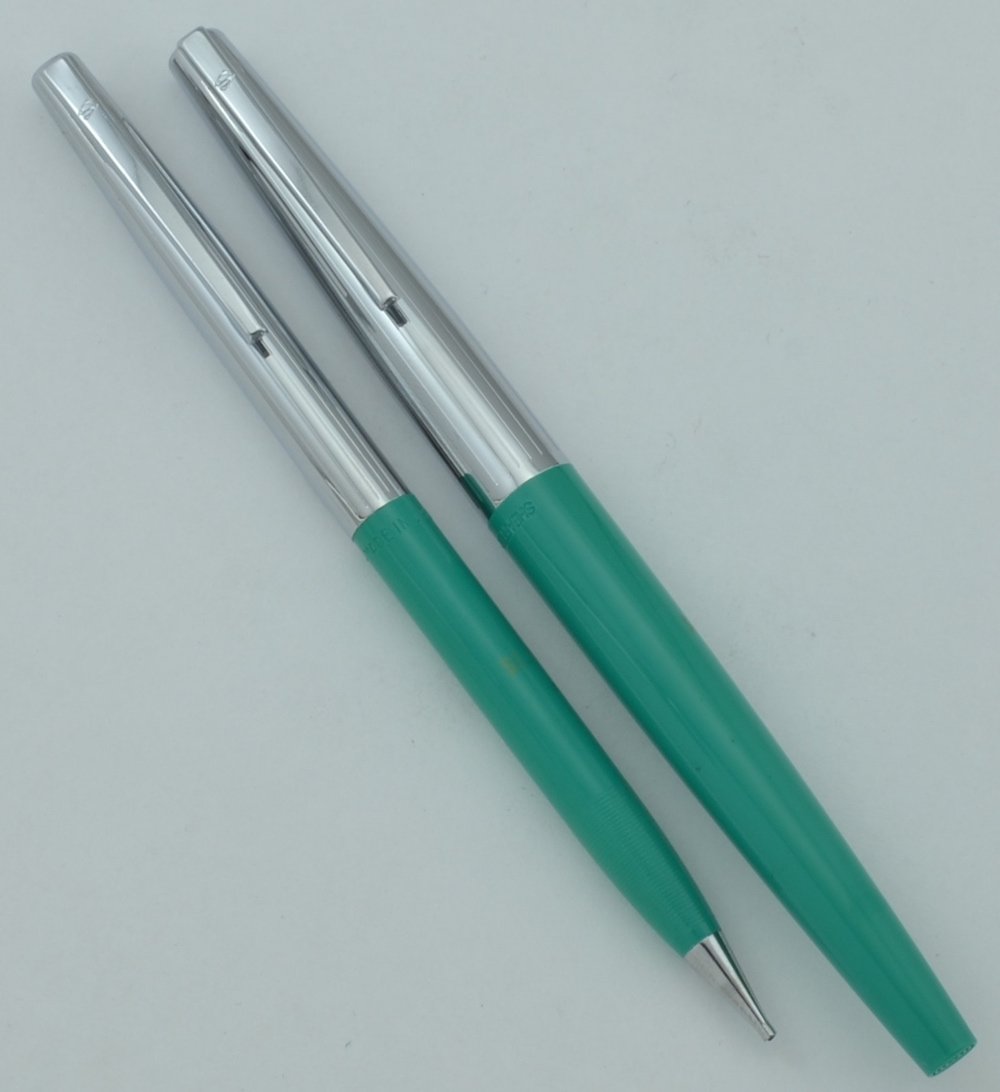Condition Mint condition, probably not used more than once or twice. There's some light handwear on the barrels and caps and a few very small marks of light staining on the barrels. Both pieces have their original price stamp still intact - the pen says $2.98 Fine, the pencil says $1.98 (see photos). They are both free of any cracks, chips, dings, dents, or plating wear. They are working well and will ship in their original box, which has a crack in its plastic top.