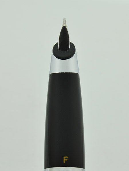Nib Fine steel nib. It's semi-hooded and has lots of tipping material. The section is labeled F.