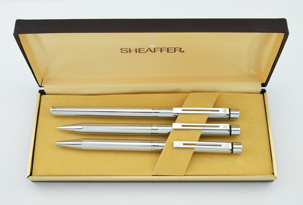 Condition Excellent + condition. No cracks, chips, dings, dents, or personalization. There's a small mark of wear on the rollerball's cap, right next to its clip. There are a few very light marks on the other pieces, probably acquired in the box, but hardly any real wear. Both pens and the pencil are working very well and look beautiful in their Sheaffer box with original Sheaffer handout.