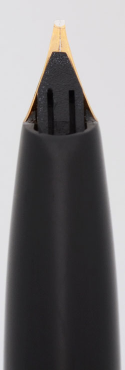 Nib 14k Right Oblique gold nib is inlaid style. The cut is very subtle, almost square. (There was some tarnish on the nib in the photo, but it polished off.)