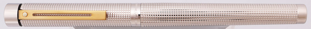 Color Silver plated body and cap with a pattern of fine checks. It has gold plated trim and a white dot on the clip.