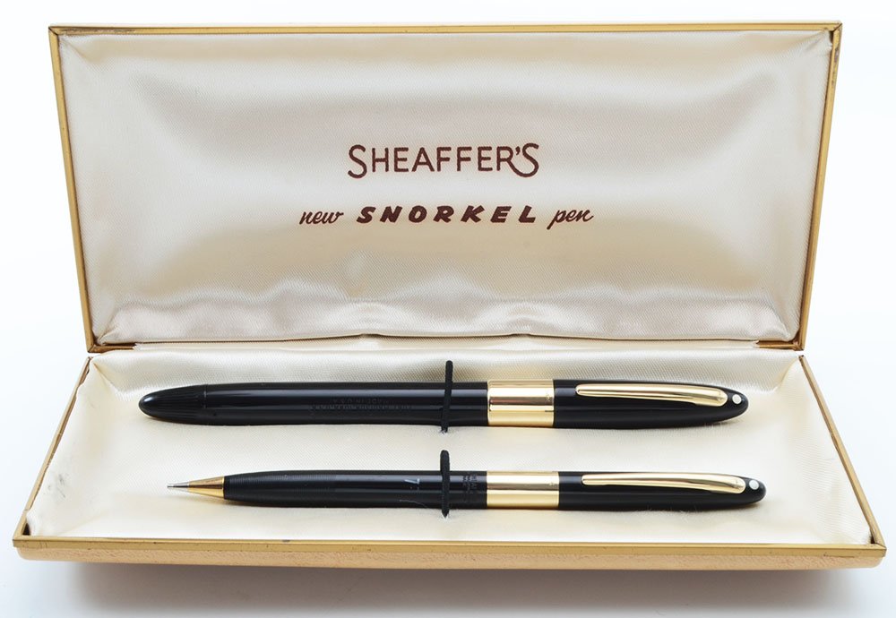 Condition Superior condition with very light scratching on the barrel of the pen. No cracks, chips, dents, or dings. The set comes in its original Sheaffer's "New Snorkel Pen" box. The imprints are clear.