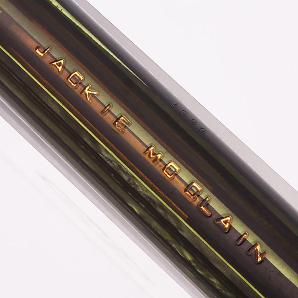 Condition Excellent condition with no cracks, chips, dents, or dings. This is a beautifully colored, shiny pen in a classic design. The cap and barrel have mainly light with some areas of moderate scratching. The barrel is personalized, "Jackie McClain". The cap band has moderate microscratching and a little bit of plating wear. The clip has light microscratching with a small dot of pitting near the end. The white dot has yellowed. The barrel imprint is clear.